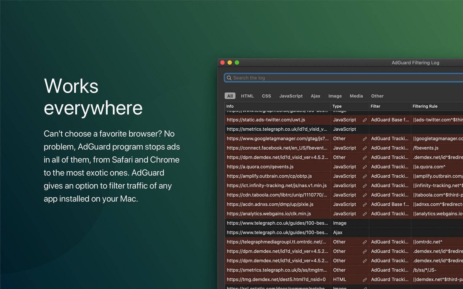 Designed for macOS, AdGuard will instantly adapt to your workflow. It has dark mode support, a clean and simple UI, and all the things you love about Mac apps. When it comes to browsers, AdGuard doesn’t ask you to choose one. The app covers more than just Chrome and Safari, allowing you to enjoy safe browsing anywhere.