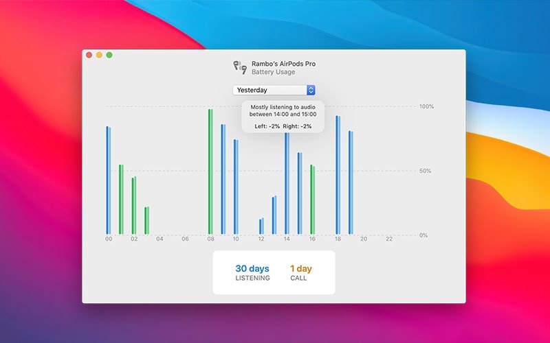 – View historical usage data for your AirPods, including listening time, talk time, and battery life, for the previous 12 hours, 24 hours, or the previous day. See a summary of your usage, including total listening time and total talk time, and whether your AirPods (left or right) are draining battery faster than the other.