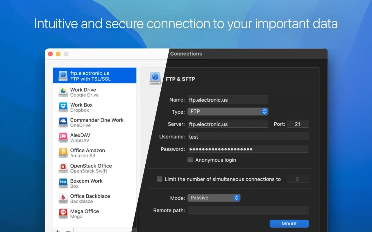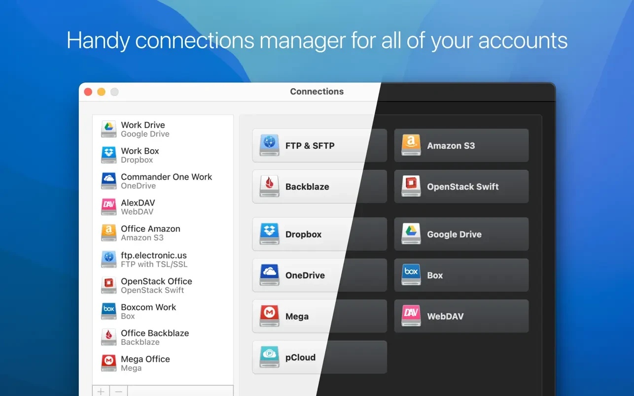 Access your files across all your cloud storage accounts from a single app. Customize login and authorization for each cloud storage provider from the CloudMounter menu. The app currently supports: Dropbox, Google Drive, Microsoft OneDrive, Amazon S3 with custom server endpoints, FTP/SFTP/FTPS, OpenStack Swift, Box, BackBlaze B2, WebDAV, and more are coming.