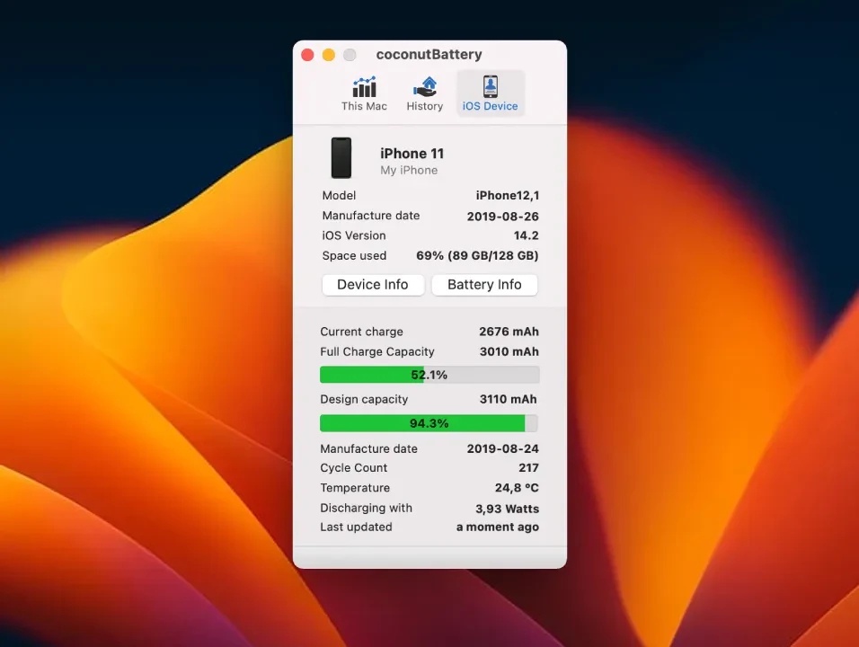 With CocoBattery, you will always be aware of the current health of your battery. It shows you up-to-date information about the battery of your Mac, iPhone and iPad, including: