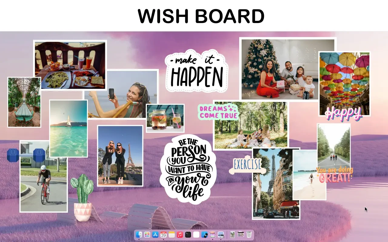 Attach photos of your happiest moments, your favorite people, places you’ve visited, food, events, etc. Constantly add to your “happiness board”.