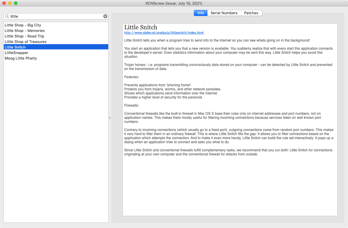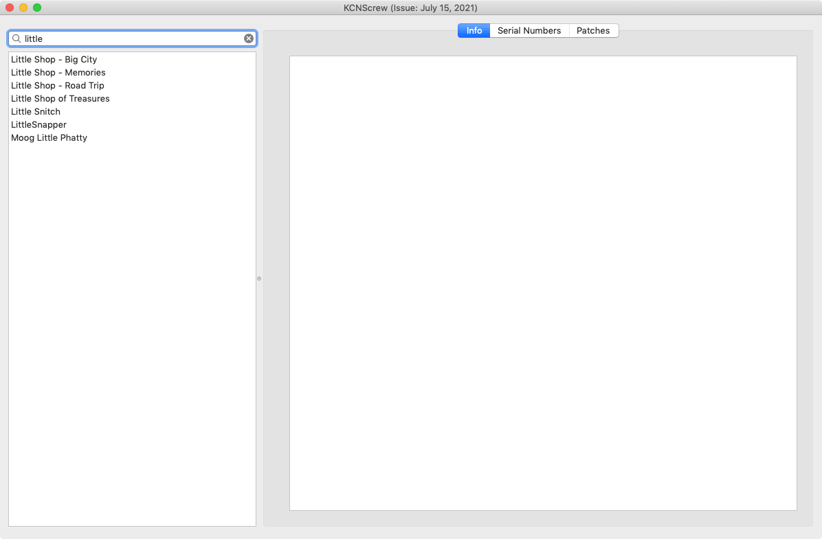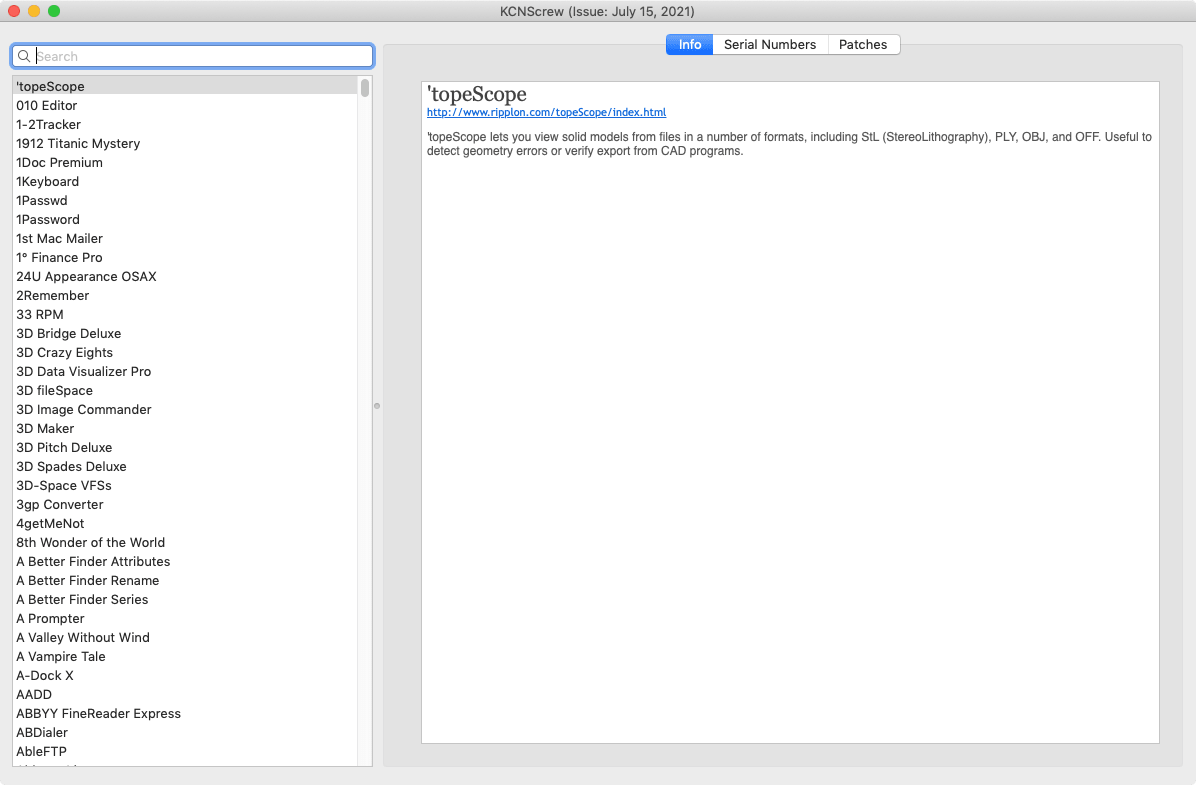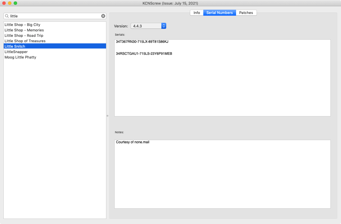 KCNcrew Pack is a huge collection of serial numbers for software for macOS with a convenient shell for viewing and searching. It has existed for a very long time and is updated every month!