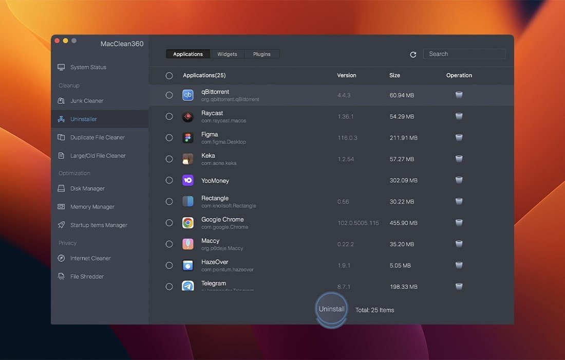 – Uninstaller: You can uninstall unwanted apps and clean all related files with one click. Just select the apps, then click the "Uninstall" button to remove all useless apps.