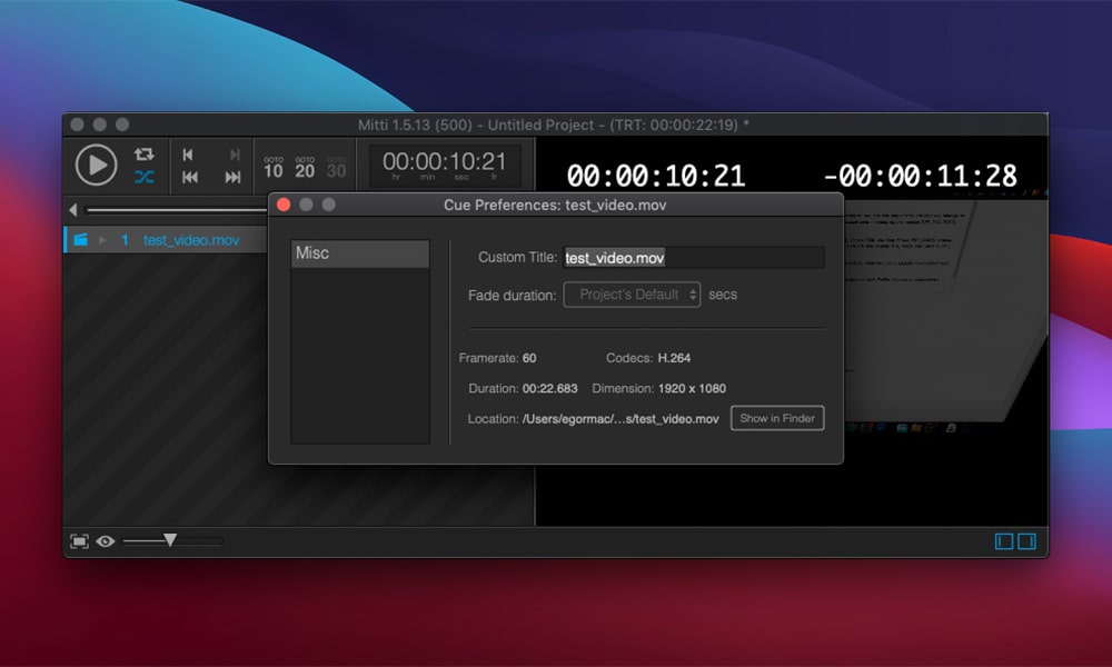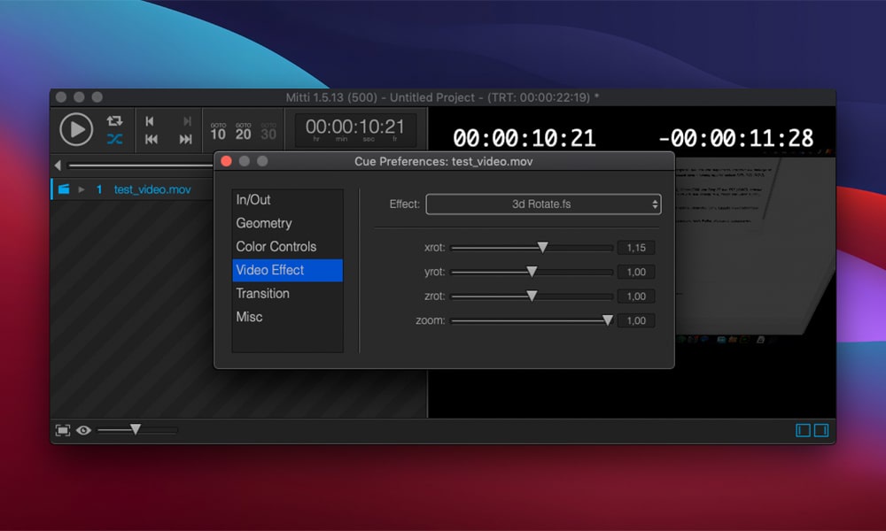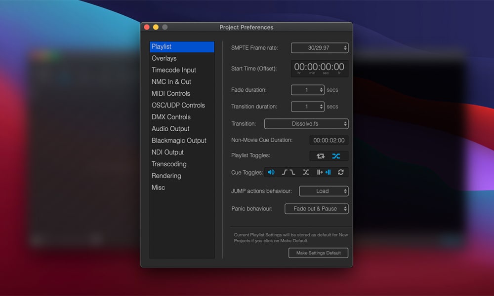 You can create Cues in Mitti from video and still image files, a rich set of inputs including cameras, Syphon and NDI sources. Cues have their own individual color, video effect, audio output and transition settings. In Mitti’s playlist settings, you can define default times for Fade-Ins/Outs and Transitions, as well as the default SMPTE format and SMPTE offset. and much more.