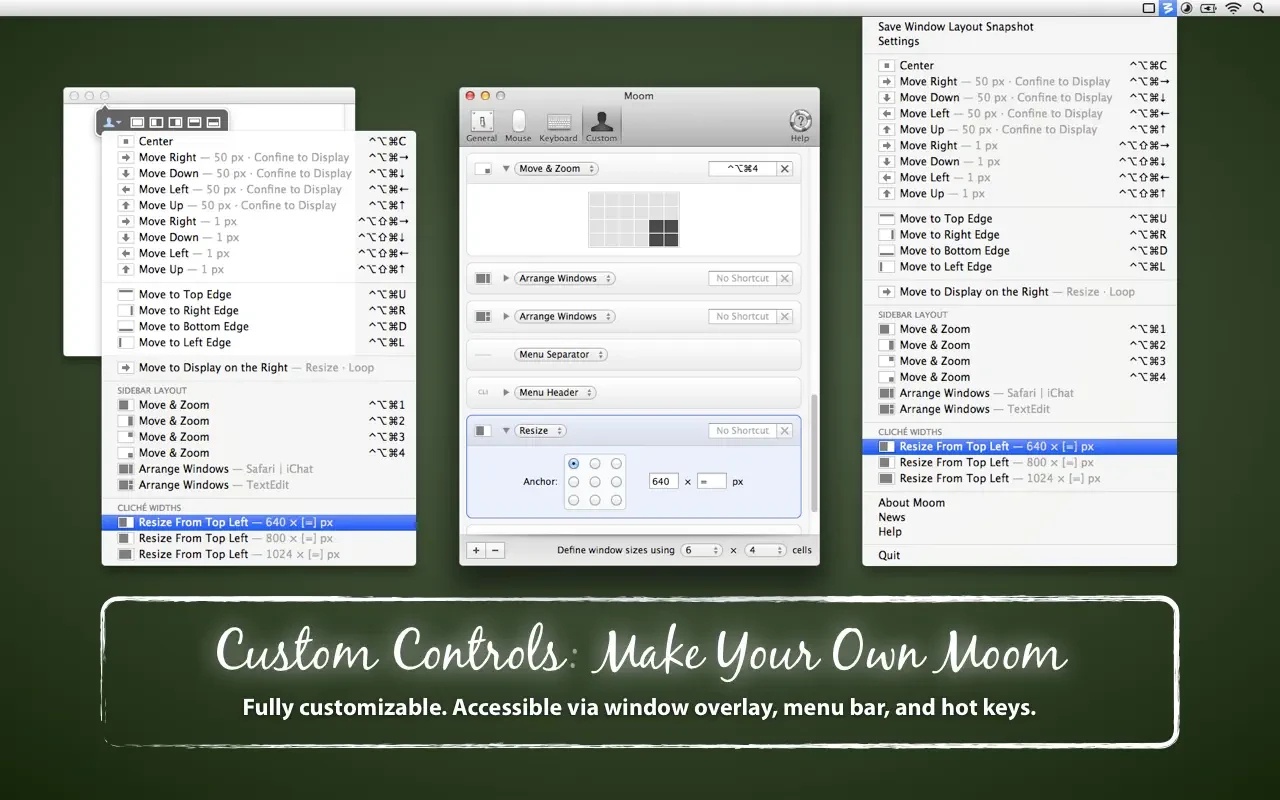 Don’t think that all the functionality of Moom is limited to five fixed window sizes. Not at all – it is enough to enable the Enable Move & Zoom Grid option in the program settings menu, and the user gets the opportunity to independently, and most importantly, quickly set the size and location of the window using a convenient schematic table.