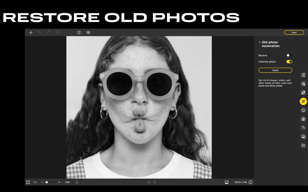 The photo editing program for Mac removes dust, cracks and small spots from scanned old photos. If the image has turned yellow, Photo Editor will restore its original colors. The program can also automatically colorize a black and white photo.