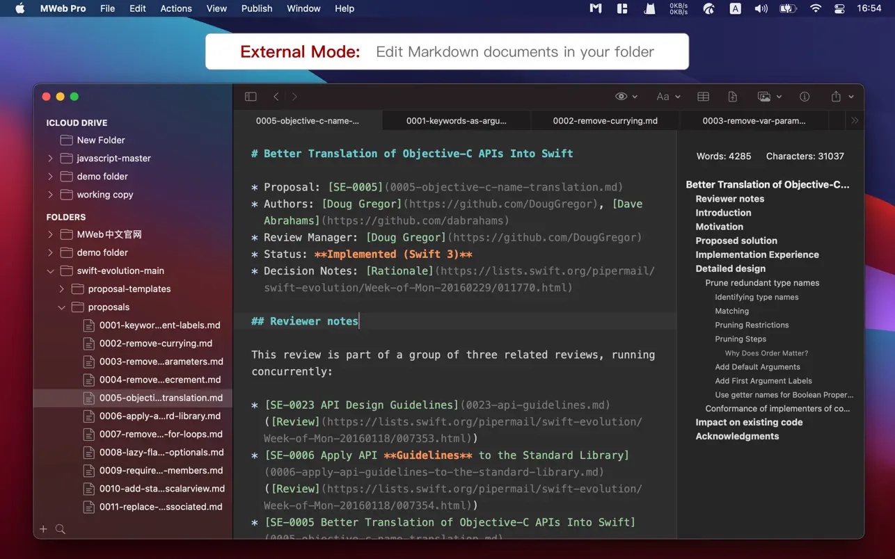 * MWeb has an external mode that allows you to import existing markdown files in directories. It also handles Gitbook, JekyII, and Hexo content.