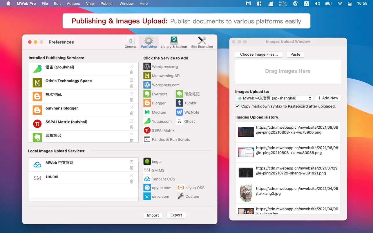 * Seamless support for image upload services: using Imgur, Qiniu, Upyun or your custom API.