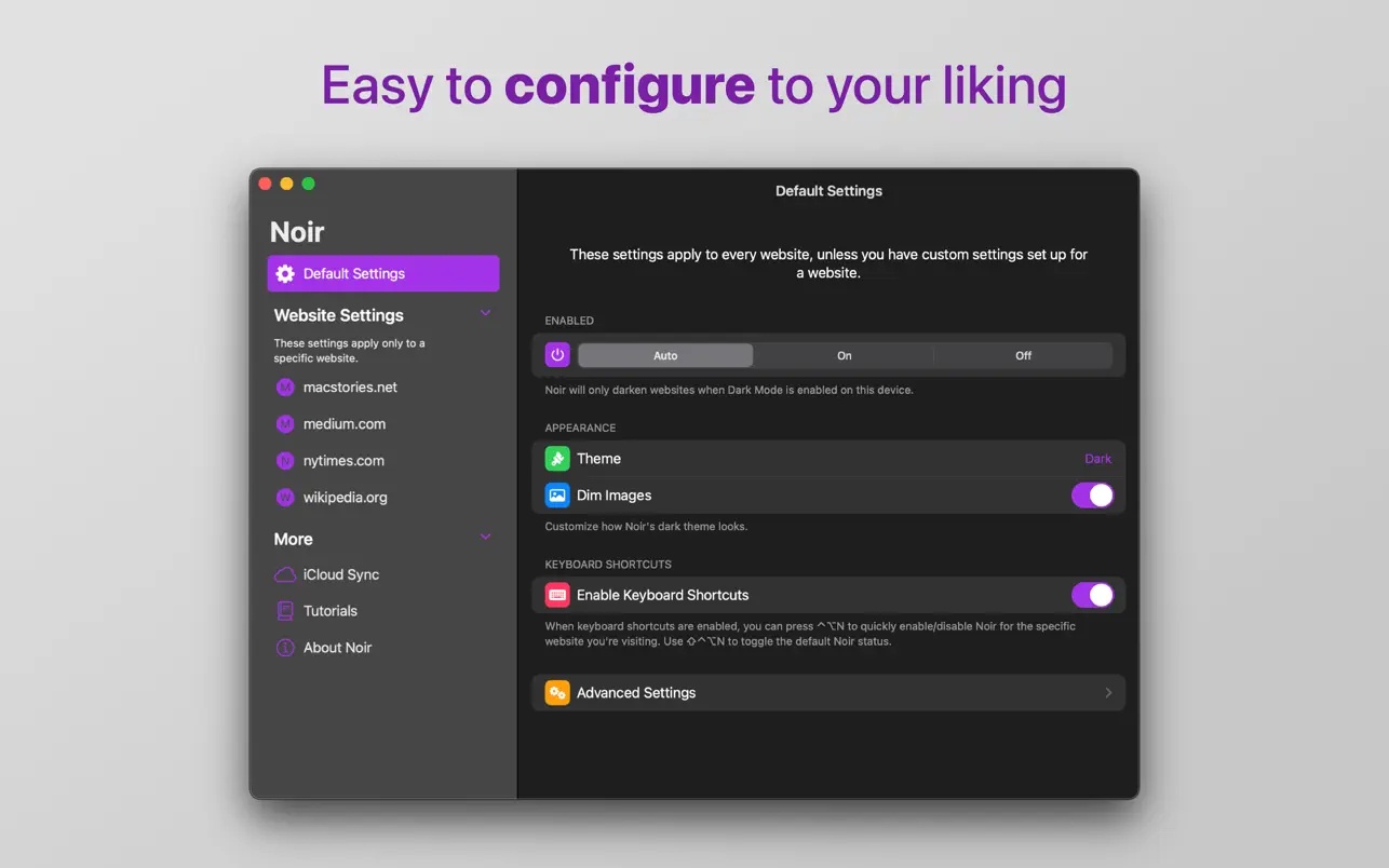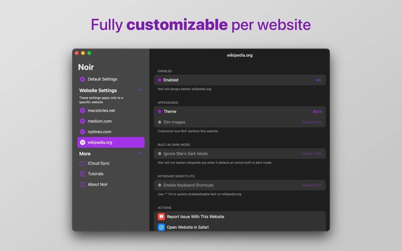Noir works automatically with any website you visit in Safari. By default, Noir is linked to your device’s dark mode, so websites will only turn off when you want them to. But you can easily customize this to your liking, even on a per-website basis. Want to use Noir on just a few specific websites? Sure! Disable Noir on some websites? No problem!
