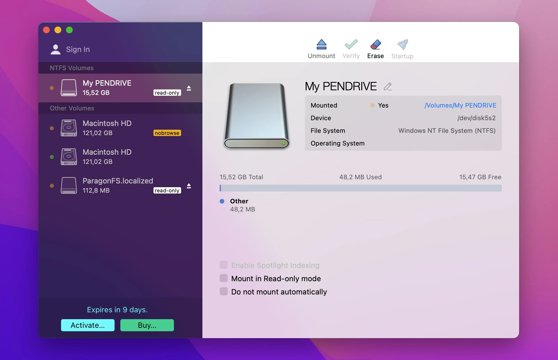 Paragon NTFS for Mac 15 fully complies with Apple’s new security policy, providing fast, easy and secure access to NTFS partitions on Mac. After installing the product, no special actions are required to gain access – edit, copy and create files and folders immediately after connecting a disk or other media in NTFS format.