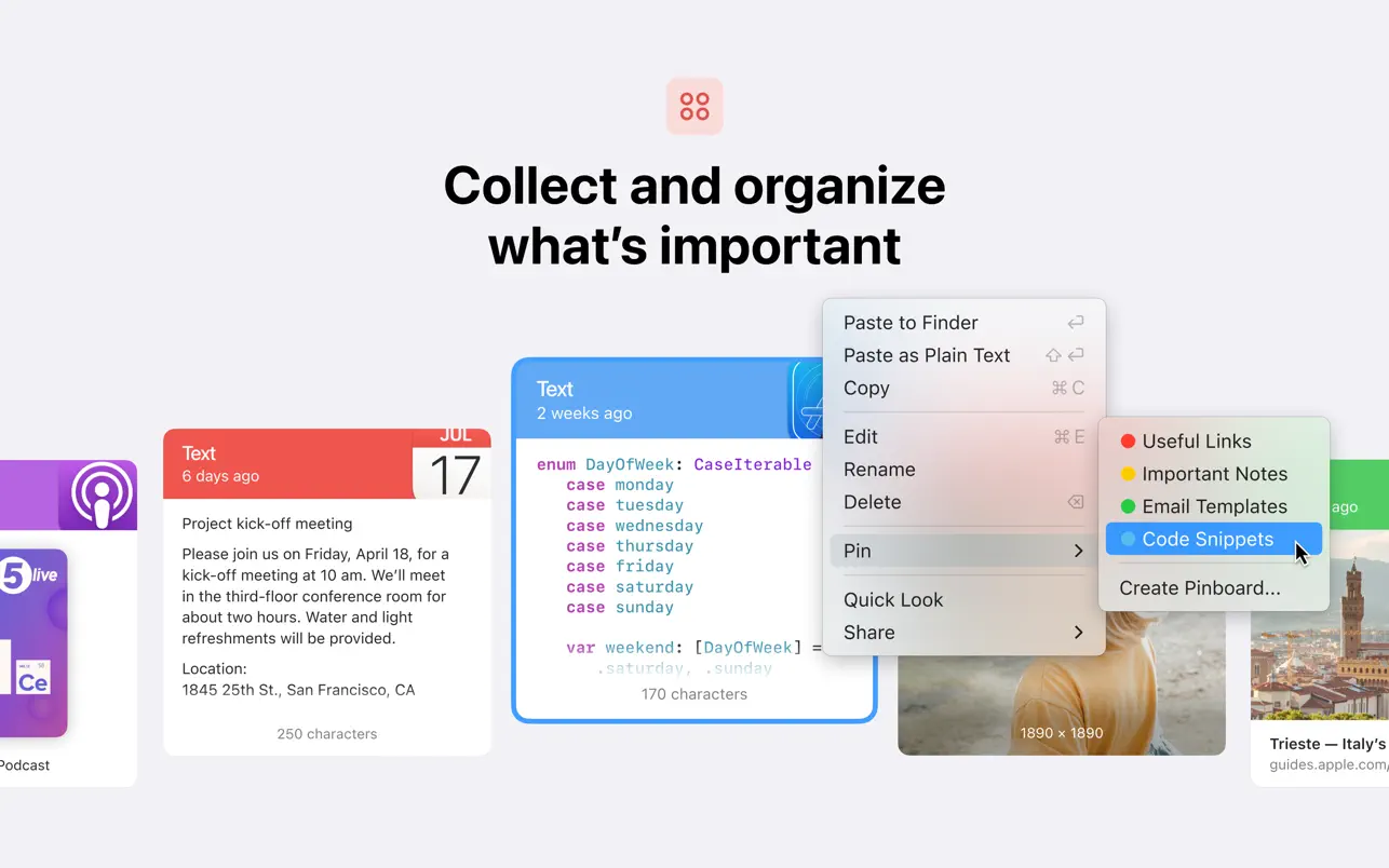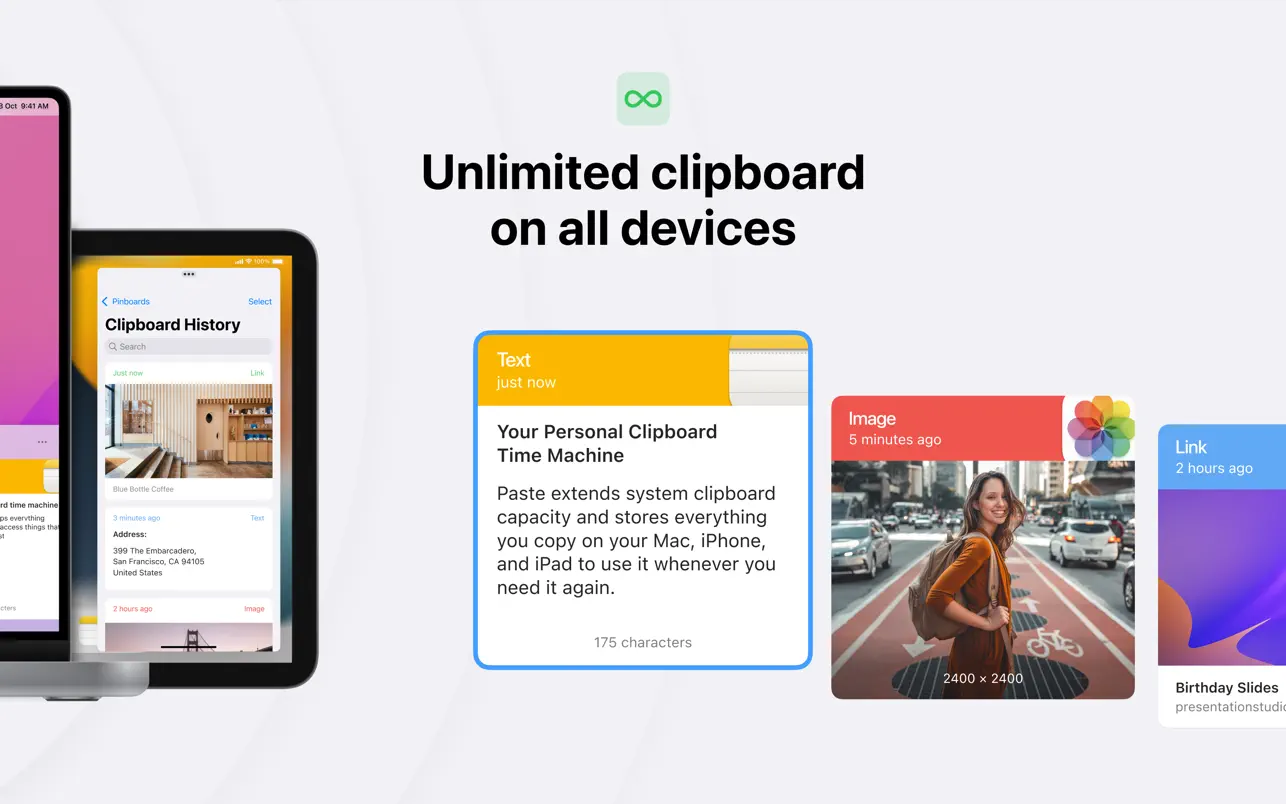 How about speeding up your daily copy/paste routine? With Paste, you can copy and paste multiple items at once and then instantly return to the previously copied fragments. Wondering how it works? It’s quite simple. This powerful clipboard history manager automatically saves everything you’ve copied, regardless of the format – text, images, screenshots, links, etc. So, when needed, you can quickly return what you need. Therefore, it’s no exaggeration to say that the app removes the limitations of your Mac’s clipboard capacity. Moreover, with this interesting program, you have a great opportunity to keep all your important history items organized in one place and easily access them on all your devices.