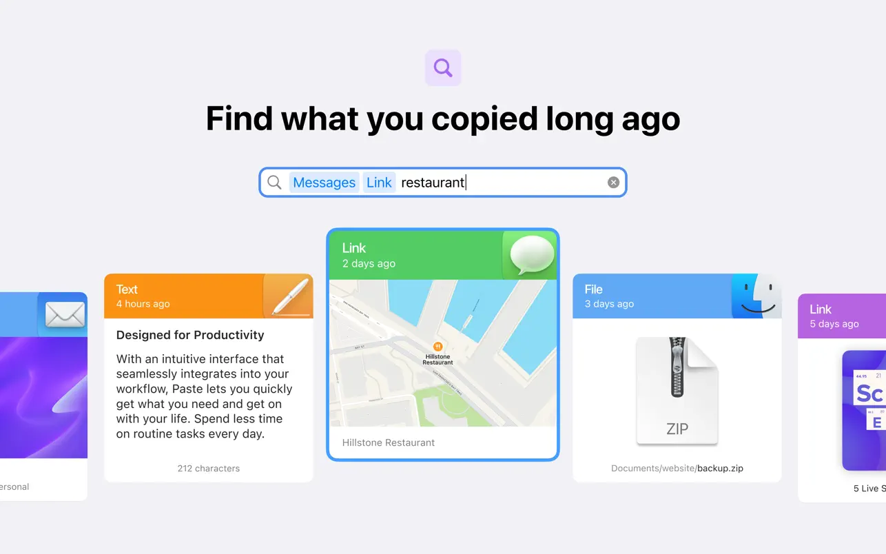 The application allows you to quickly find the text fragment you are looking for. Use smart search while typing to get the necessary copied fragment in a few seconds. It is very easy and fast. All you need to do is start typing, and Paste will instantly suggest what you are looking for.