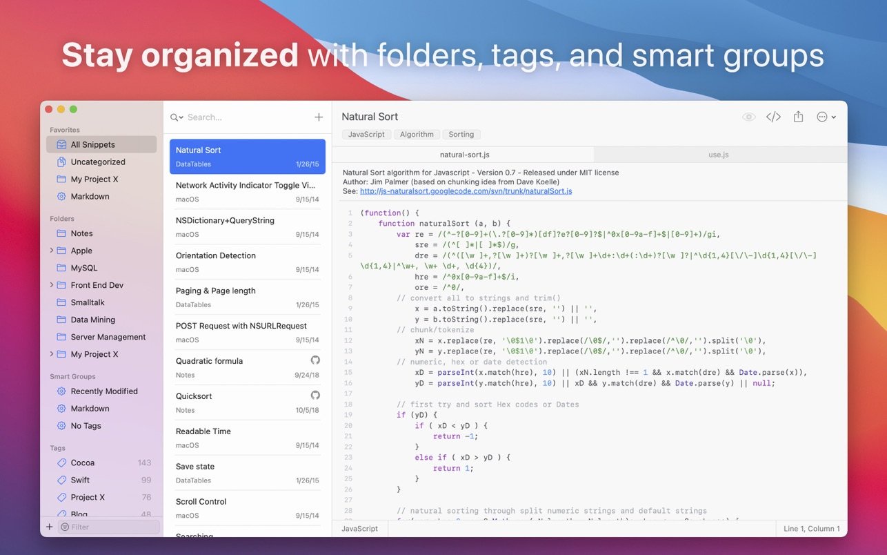 You are the creator of your code library, and you can customize it as you wish. SnippetsLab has great organization tools to help you. Sort code snippets by any characteristics, create Smart Groups, and add tags for easy navigation. And every piece will be within your reach.