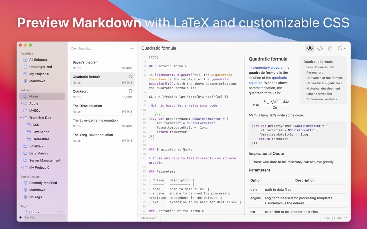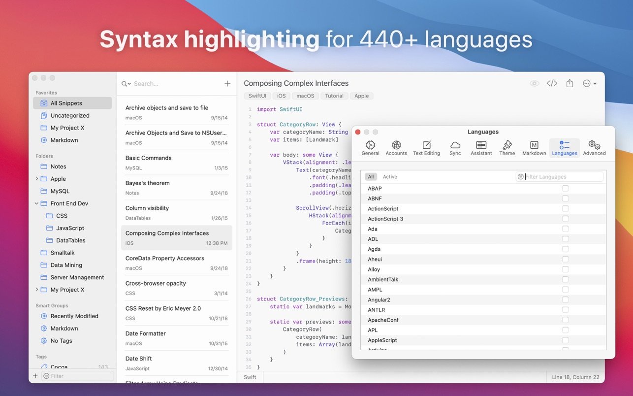 The code snippets manager supports syntax highlighting for over 420 different languages. Quickly switch your selected language at the bottom of the app window and get your code in the right format. SnippetsLab also supports markdown preview for greater clarity.