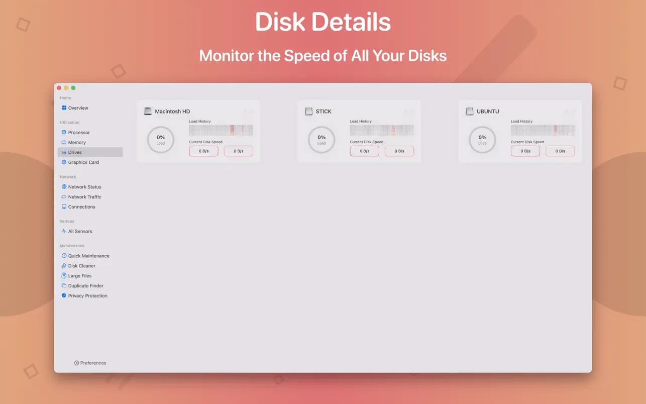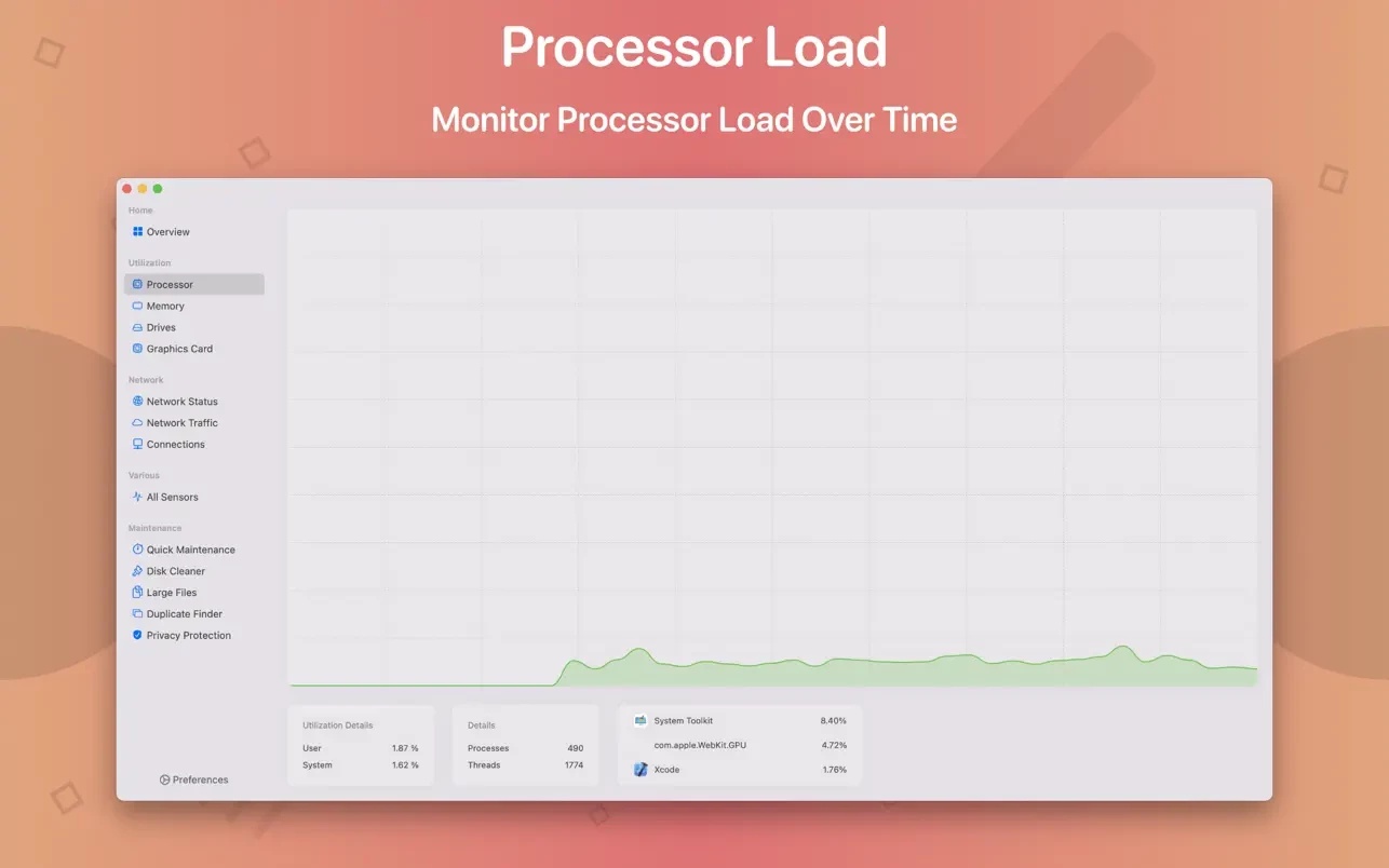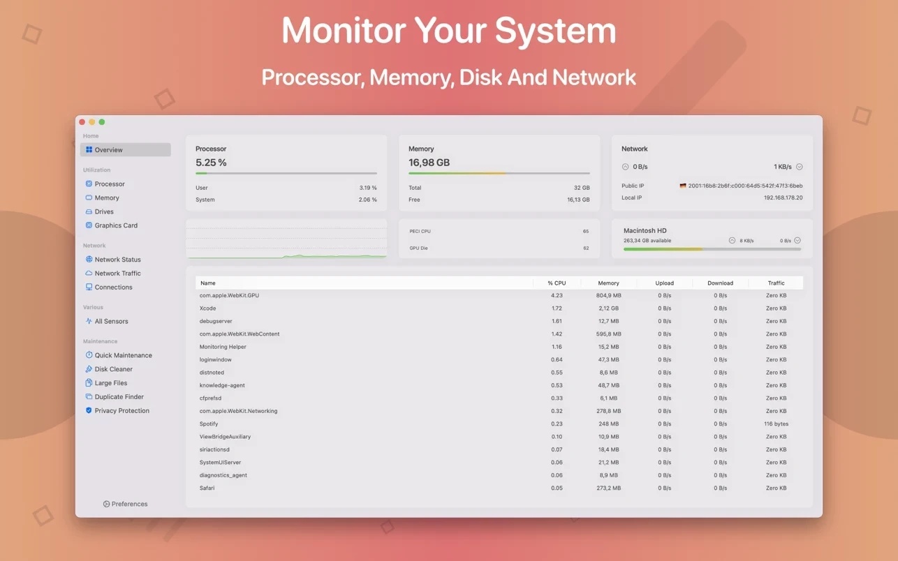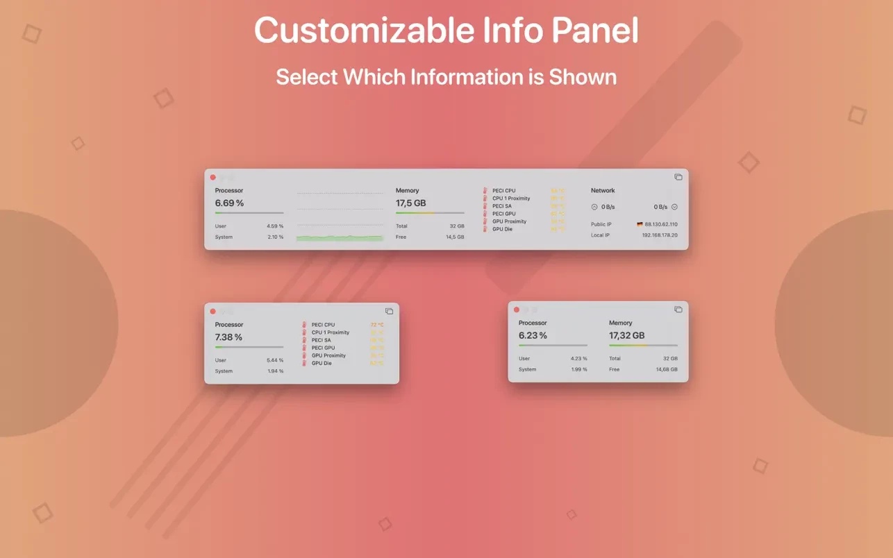 Monitor all your system loads. This includes CPU load, memory usage, network speed and traffic, and open network connections. All information can be displayed in both an additional menu bar and an overlay window. Use the Dashboard to take a look at the most important parameters.
