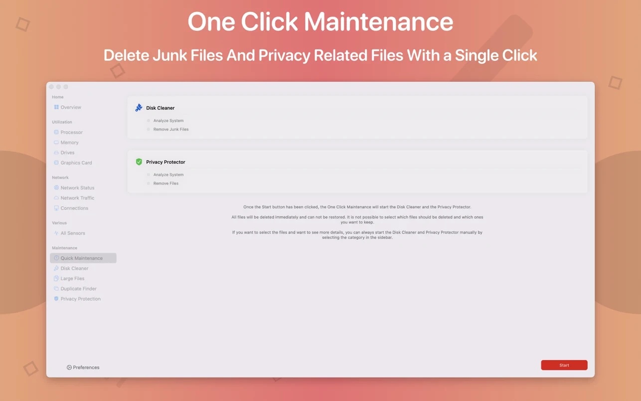This feature allows you to find large files on your hard drive. Quickly see which files are taking up the most space. Files can be deleted from the application.