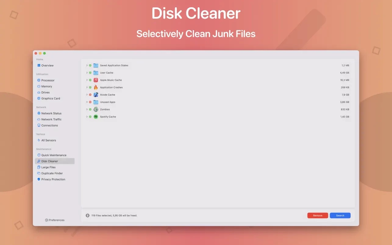 Disk Cleaner searches your entire hard drive for temporary or cached files that can be deleted to free up disk space. Categories include application and user cache, developer cache, browser cache, and many other caches.