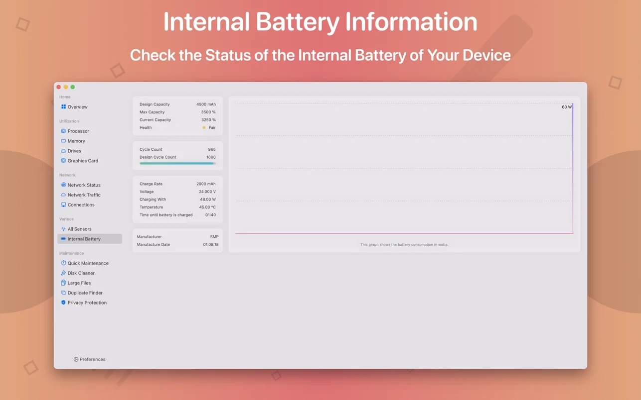 You can check your battery settings on the Battery page. This page provides detailed information about the internal battery. If you’re using a Mac without a battery, this page is hidden.
