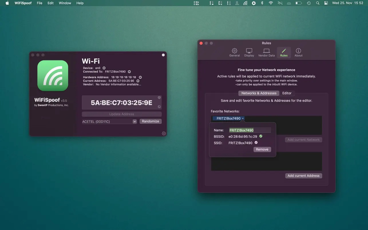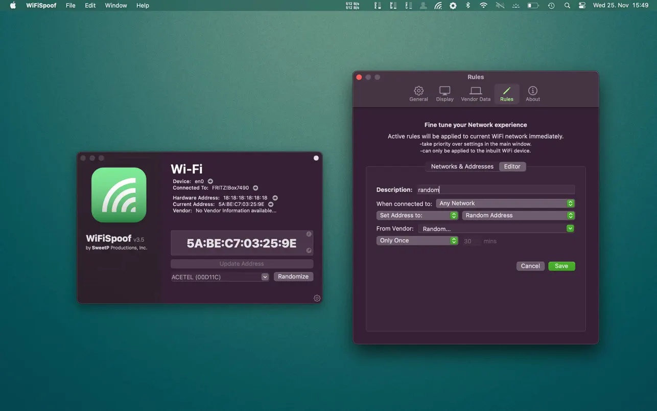 Set up custom rules for all your favorite networks – randomize every 30 minutes at your favorite coffee shop, set a predefined MAC address at work, and set a different MAC address at home. The possibilities are endless.